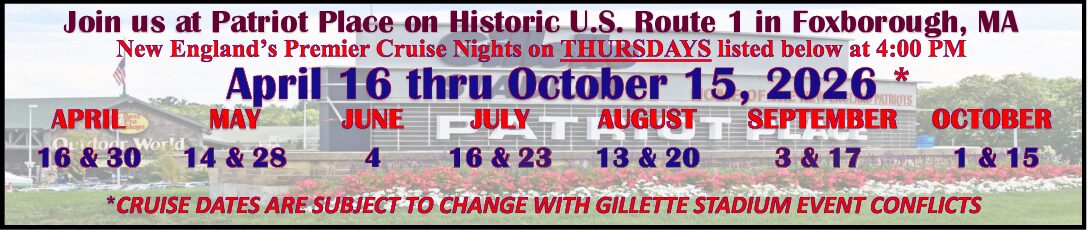 *******************************attention********************************* here are the dates for this years cruise nights. April 16th , april 30th , may 14th , may 28th , june 4th* , july 16th , july 23rd , aug 13th , aug 20th* , Sept 3rd* , sept 17th* , oct 1st* , oct 15th*. *note dates are subject to change due to scheduling conflicts with patriots place events. please be aware there is only one cruise night in june and back to back cruise nights in july and august.